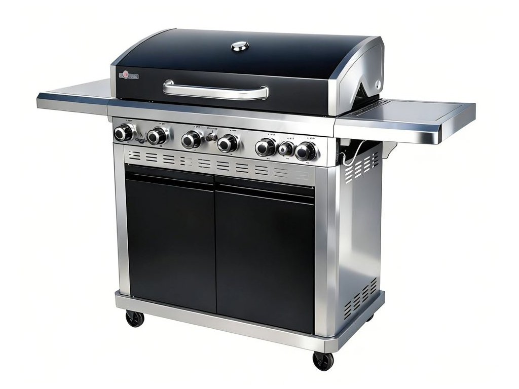 Nagy El Fuego Detroit gázgrill 6 főégővel, oldalsó égővel és öntöttvas ráccsal. Teljesítmény 18 kW, nagy grillfelület öntöttvas grilllemezzel, praktikus tárolófelületekkel és szekrénnyel a tartozékoknak